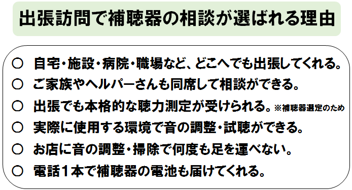 ただ、そのようなお客様ばかりではなく『健康』が理由でご来店が困難になり、付添ってもらえるご家族様がおられないため補聴器を使用しなくなるお客様や『補聴器の相談をほかの人に知られたくない』『お店に行ったら買わないといけないような…』『実際に使う環境で試聴してみたい』などの声もよく耳にしました。そこでこれまでにあった声にお応できるように、補聴器の相談を『出張専門